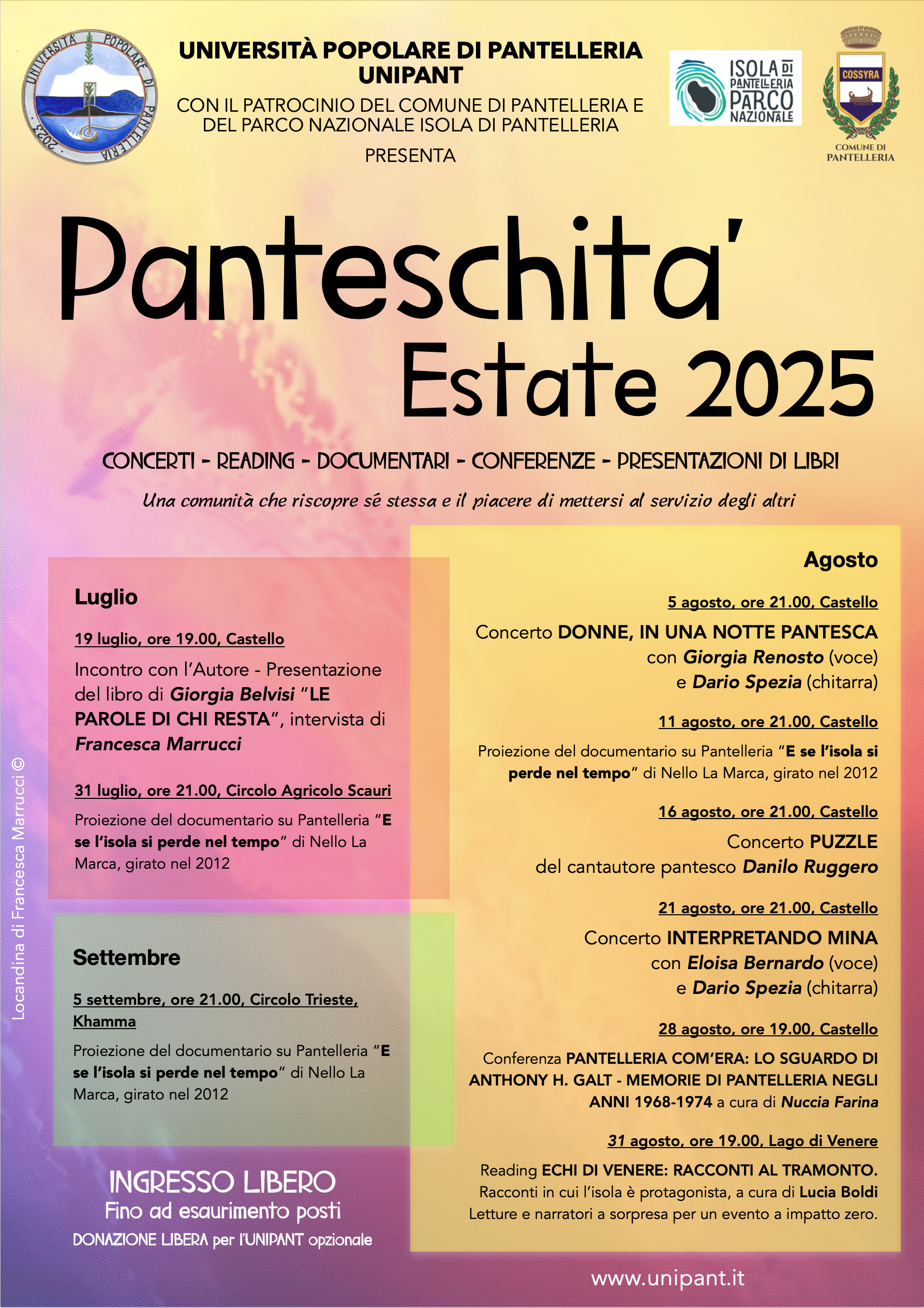 Il titolo, che ormai è un vero e proprio ‘marchio di fabbrica’ delle attività culturali dell’Università Popolare di Pantelleria, e il sottotitolo, non lasciano dubbi sugli scopi di questo progetto: “Panteschità Estate 2025 – Un comunità che riscopre sé stessa e il piacere di mettersi al servizio degli altri”.